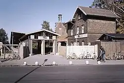 In 1892, a second track was built and the two-storey, yellow brick station building was built north of Bahnhofstrasse. The station offices were on the ground floor of the unadorned functional building and upstairs there was the stationmaster's apartment. A house for rail officials was built to its north in the same style and between the two there was single-storey building with commercial space and toilets.[4]
