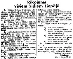 12. ^ a b "Rikojums visiem zidiem Liepaia" (PDF). Kurzemes Vārds (in Latvian). No. 4. 5 July 1941. p. 1. Archived from the original (PDF) on 30 October 2018. Retrieved 30 May 2016. Online version from National Library of Latvia website.