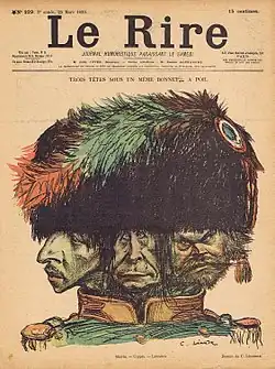 ![]() 1899 caricature by Charles Lucien Léandre depicting Barrès, Coppée and Lemaître as the three heads of the League | |