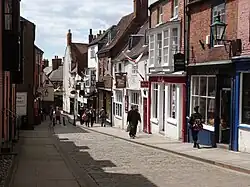 The city centre is divided into Uphill, Downhill, Steep Hill, Cornhill, Brayford and past the railway station.[4][5] These areas are connected by the ancient Ermine Street which is known as the High Street, in Downhill the High Street becomes The Strait then Steep Hill connects to Uphill where it becomes Bailgate.