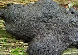 The plasmodium is sepia-toned, brown-black or black. The fruiting body is usually pseudoaethalioid, occasionally aethalioid or on rare occasions even sporangiate. The fruiting bodies form dense groups which are mainly sessile or, rarely, borne on a stipe. The single sporangia are cylindric and create a spotted to cushion-shaped aethalium with a diameter from 1 to 15 cm (0.39 to 5.91 in) and a thickness from 2 to 10 mm. Its thickened, black or dark brown surface is composed of incompletely developed peridium walls and spores, and covers the ochre- to olive-brown interior. The endings of the single sporangia are slightly rough up to distinctly curved outwards and spherical. Their diameter is from 0.4 to 0.8 mm.[1]