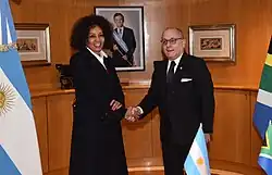 In the aftermath of the Nasrec conference, in February 2018, Ramaphosa replaced Zuma as national president. He appointed Sisulu to replace Maite Nkoana-Mashabane as Minister of International Relations and Cooperation in his new cabinet.[86] Soon after her appointment, she commissioned a comprehensive review of South African foreign policy, which was led by Aziz Pahad.[87] The Mail & Guardian commended her for "bringing a new energy" to the Department of International Relations and for being "an assured and charming representative of South Africa".[88] In November 2018, human rights advocates criticised South Africa's decision to abstain from a Third Committee resolution which condemned the Rohingya genocide in Myanmar,[89] but, soon afterwards, Sisulu announced that her department would reverse its position as part of a broader policy of taking a stronger stance on human rights issues.[90] Indeed, South Africa supported the same resolution when it appeared before the United Nations General Assembly.[91]