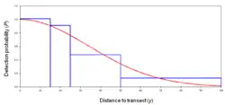 In summary, modeling how detectability drops off with increasing distance from the transect allows estimating how many objects there are in total in the area of interest, based on the number that were actually observed.[2]