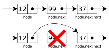 In computer science, a linked list is a linear collection of data elements whose order is not given by their physical placement in memory. Instead, each element points to the next. It is a data structure consisting of a collection of nodes which together represent a sequence. In its most basic form, each node contains data, and a reference (in other words, a link) to the next node in the sequence. This structure allows for efficient insertion or removal of elements from any position in the sequence during iteration. More complex variants add additional links, allowing more efficient insertion or removal of nodes at arbitrary positions. A drawback of linked lists is that data access time is linear in respect to the number of nodes in the list. Because nodes are serially linked, accessing any node requires that the prior node be accessed beforehand (which introduces difficulties in pipelining). Faster access, such as random access, is not feasible. Arrays have better cache locality compared to linked lists.