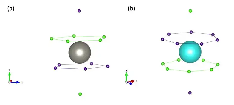 The Luder electron-repulsion theory structures of (a) the zinc atom and (b) the ytterbium atom. The zinc nucleus is coloured gray and the ytterbium nucleus is coloured cyan, while the electrons are coloured either purple or green to distinguish between the spin sets.