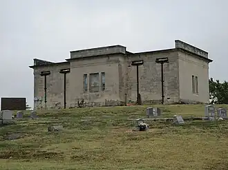 The Linwood Mausoleum is a massive limestone structure in Linwood Cemetery, Paragould, Arkansas. Occupying the highest ground in the cemetery, it is a rectangular single-story Classical Revival limestone structure, with stained-glass windows. Its interior walls are finished with gray-veined white marble. The entry is sheltered by a portico with Doric columns. The mausoleum houses 170 crypts. Built in 1920 by a group of private citizens, it was later conveyed to the city, and is (as of 2007) Arkansas' only known city-owned mausoleum. It is also architecturally distinctive in the region for its heavy limestone construction and Classical Revival features.[2]