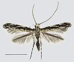 The forewing length is 3โ3.5 mm (0.12โ0.14 in).[3] The larvae feed on Lespedeza bicolor, Lespedeza cyrtobotrya, Desmodium oldhamii, Ohwia caudata, and Hylodesmum podocarpum.[1][3] They mine the leaves of their host plant.[3]