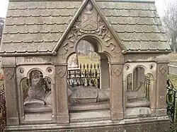 The tomb of Lion Gardiner in East Hampton, New York was built in 1886 and designed by James Renwick Jr. It depicts him in recumbent effigy. (Photo, April 2006)