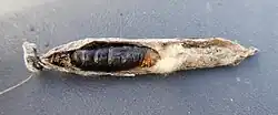 Males usually emerge from the pupa in the early morning.[3][8] When ready to emerge, the male pupa forces its way to the narrow exit of the bag and extends the front part of the body through the hole.[7] Held in place by spines on the abdomen, the pupa then splits and the adult male emerges.[7] He then clings to the bag while the wings expand and harden.[7] When mating, the male inserts the telescopic end of his abdomen through the narrow end of the female's bag.[2] She lays her eggs within the bag and dies. The caterpillars emerge through the narrow end of the female's bag and disperse via crawling, lowering themselves on silk threads or by wind.[2][7]