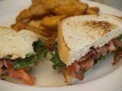 This is a list of American sandwiches. This list contains entries of sandwiches that were created in, or commonly eaten in, the United States. A sandwich is a food item consisting of one or more types of food placed on or between slices of bread, or more generally any dish wherein two or more pieces of bread serve as a container or wrapper for some other food.[1][2][3] The sandwich was originally a portable food item or finger food which began its popularity primarily in the Western World, but is now found in various versions in numerous countries worldwide.