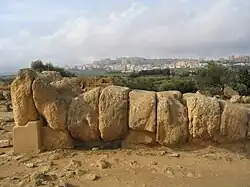 • The Temple of the Olympian Zeus, Agrigento, is termed pseudo-periteral heptastyle, because its encircling colonnade has "pseudo" columns that are attached to the walls of the naos. (Figure 8.) Heptastyle means that it has seven columns across the entrance front.[2]