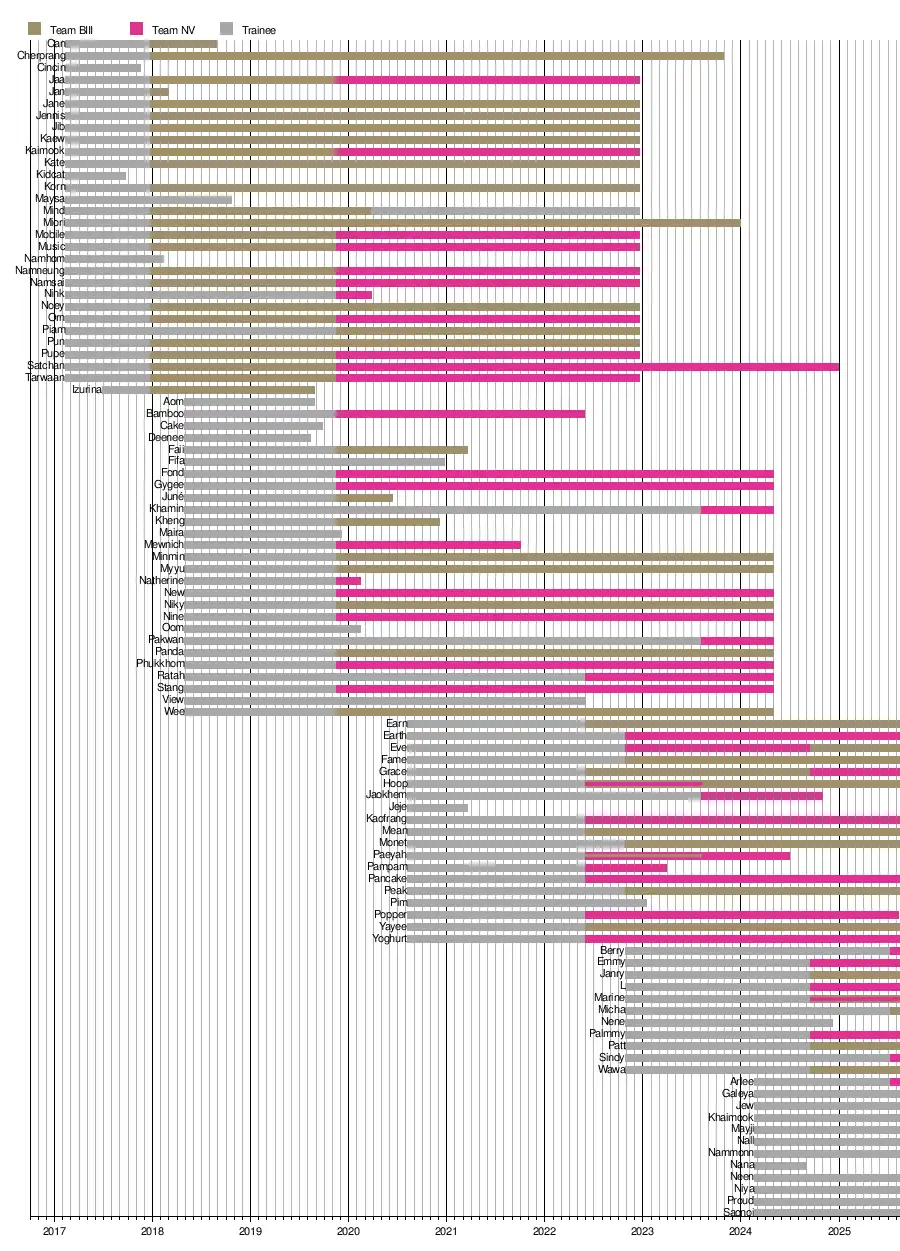 Team NV (read N five) formation was announced during Pun's birthday stage on 16 November 2019. Initially, Tarwaan was the team captain while Pupe was vice captain.[5][6] After Tarwaan, Pupe, Nine and Popper left the group, Kaofrang is serving as the team captain and no any members is serving as the team vice captain.[3]