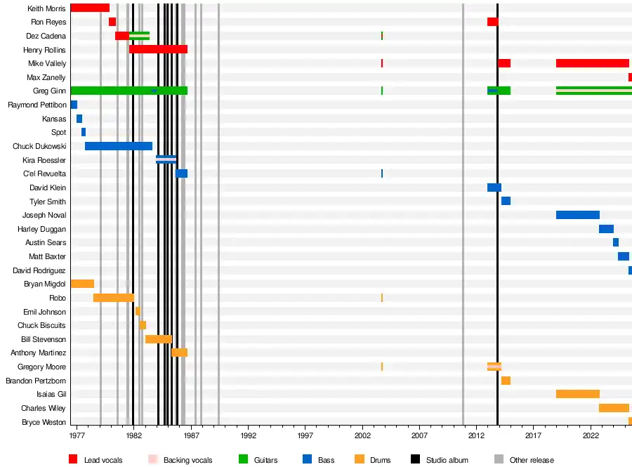 Black Flag is an American hardcore punk band formed in 1976 in Hermosa Beach, California by Greg Ginn, the band's guitarist, primary songwriter, and sole constant member. During Black Flag's 10-year existence, the band went through 16 distinct lineups involving 17 different musicians. Aside from Ginn, the longest-lasting members were bassist Chuck Dukowski (6 years), vocalist Henry Rollins (5 years), vocalist Keith Morris (3½ years), and drummer Roberto "Robo" Valverde (3½ years). The 1983–1985 lineup of Ginn, Rollins, bassist Kira Roessler, and drummer Bill Stevenson recorded four albums and three EPs together in a sixteen-month period. After breaking up in 1986 and briefly reuniting in 2003, Black Flag announced another reunion in January 2013. One version of Black Flag is currently touring (2024) : the original band founded by Ginn known as Black Flag.