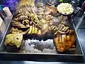 Mont lin mayar or mont oke galay မုန့်လင်မယား or မုန့်အုပ်ကလေး Snack of rice flour batter fried to a hemispherical shape in a dimpled pan, and served in pairs.
