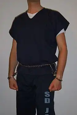 San Diego jail inmate, dressed in a dark blue two piece uniform, restrained with handcuffs on a belly chain