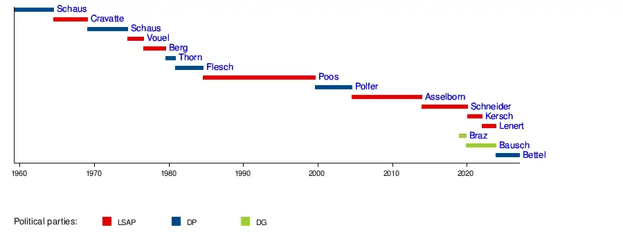 Eugène Schaus | DP | 2 March 1959 | 15 July 1964 | Coalition partner changed[3] | Pierre Werner | Werner-Schaus Ministry I | ||