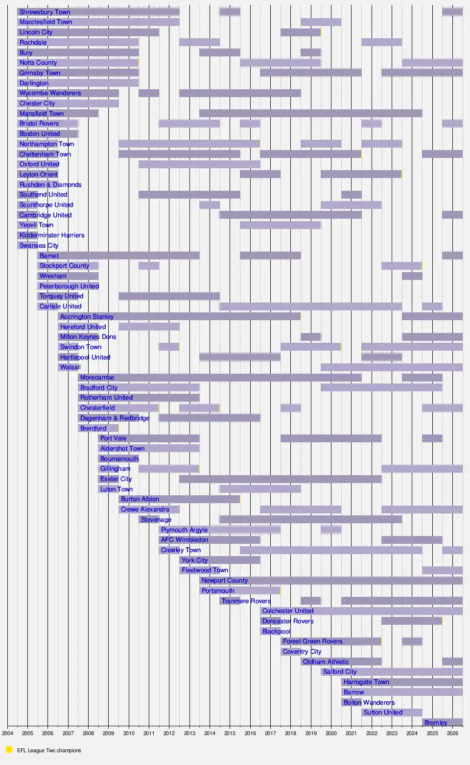 EFL League Two teams playing in the 2025–26 season are indicated in bold. If the longest spell is the current spell, this is indicated in bold, and if the highest finish is that of the most recent season, this is also in bold. A total of 71 teams have played in League Two. Clubs in italic no longer exist as the legal entities they competed as in League Two.