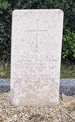 | Edward Jones | 17 March 1940 | Cimetière Communal Warloy-Baillon | Joined the IWGC as a Gardener's Labourer in March 1920. By 1934, Edward had been promoted to Head Gardener at Warloy-Baillon. Died age 40 due to a car accident. Had previously served in the Royal Welsh Fusiliers & South Lancashire Regiment during World War One.[13] | ![]() |