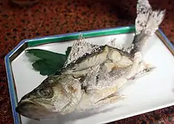 • Yakizakana (焼き魚) is flame-grilled fish, often served with grated daikon. Was one of the most common dishes served at home. Because of the simple cuisine, fresh fish in season are highly preferable. Some species traded as dried fish, such as hokke (Arabesque greenling) are also served this way.
