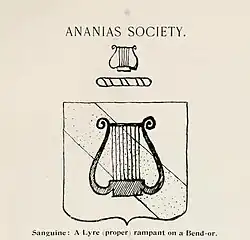 The Ananias Society was a secret society established in the early years of the University. The first mention of the society in the first yearbook was published in 1889 under the name "Debutante" (which later became the Hullabaloo in 1894). The Society's motto is "Let fa (w) ncy Unmolested Reign" and their colors were similar to the University's colors of Sable & Gold. They referred to their members as either "Lyres Attuned" for initiated members and "Liars Out of Tune" for pledging members. Like most societies of their day, they primarily only publicly referred to their members by their nicknames. The pledging class of 1892 consisted of "The Scorpion", "The Baron", "Julep", "Amelia" and "Sam". The officers of the Society also had strange titles. They continue to be referenced in university publications for several years, but there is no mention of the Society in either the Alumni Magazine or the Hullabaloo soon after.[16]