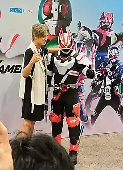 Official suit of Kamen Rider Geats at a comic con in Vietnam, posing with Masahiro Inoue.