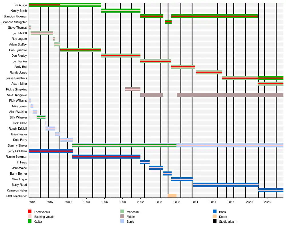 During the summer of 1988, the LRB lost both Steffey and Fesler, with Dan Tyminski taking over initially on banjo before switching to mandolin.[3] Tyminski also took over most of Austin's lead vocal duties, while Dale Perry replaced Fesler on banjo — both members debuted on 1989's Looking for Yourself.[2] By September 1990, founding member Jerry McMillan had been replaced by Ronnie Bowman, while Perry had also made way for Sammy Shelor.[3] The lineup of Austin, Tyminski, Bowman and Shelor was the band's first to release two albums without changing personnel — Carrying the Tradition in 1991 and Old Country Town in 1994 — although both Tyminski and Shelor spent a few months away from the band during 1992, before ultimately returning.[3] In 1995, Austin became the last original member of LRB to leave the group, as he chose to "devote more time to working in his home recording studio, Doobie Shea".[4] Following Austin's departure, Shelor and Bowman subsequently took over as bandleaders.[5]