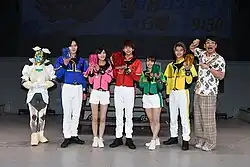 The main cast of Mashin Sentai Kiramager. From left to right: Mabushina, Shiguru Oshikiri, Sayo Oharu, Juru Atsuta, Sena Hayami, Tametomo Imizu, and Muryo Hakataminami.
