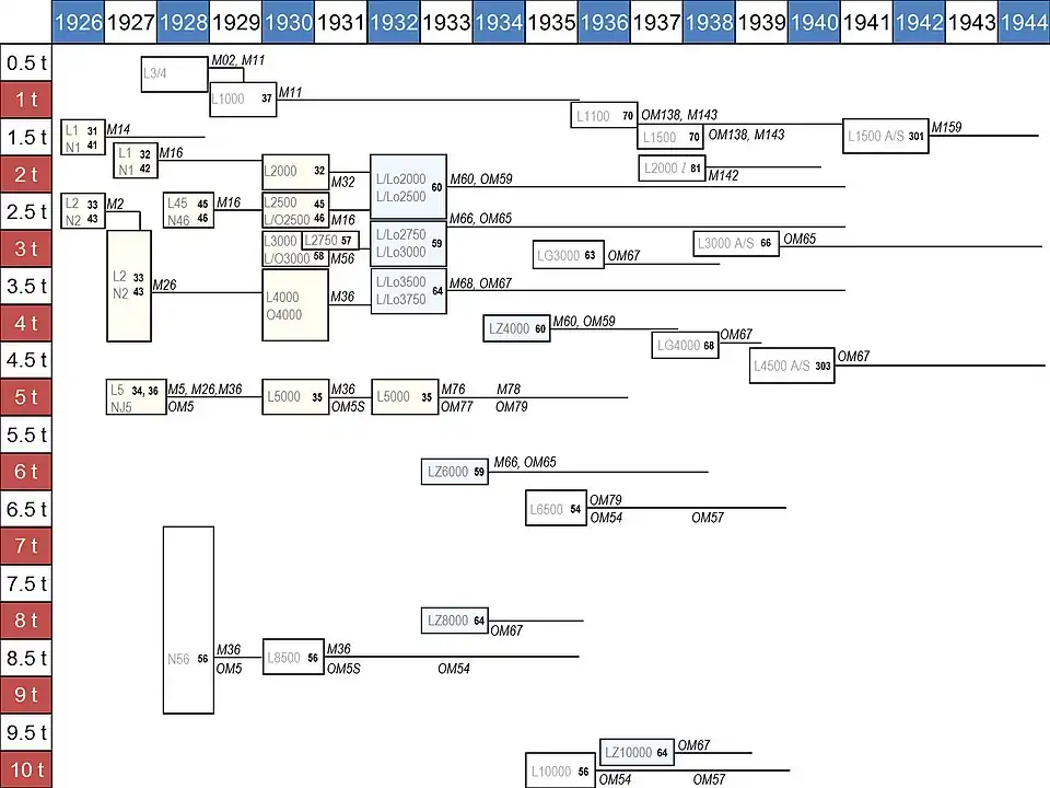 | 1934–1936 | Typ N 56 | L 8500 (6×4) | OM 54 | 6 | 12517 | 150 PS (110 kW) | 8.0 t | 8.5 t |