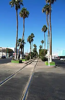 Rail tracks on Boulevard Adolfo López Mateos in Mexicali leading north to the border crossing at Calexico