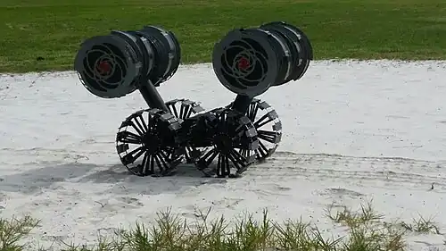 Pronounced "Razor", stands for Regolith Advanced Surface Systems Operations Robot. It is a lunar robot that will autonomously excavate soil when it is near completion, with its small tank like chassis with a Drum excavator and either side mounted on arms which can help the robot climb over obstacles that may be in its way. With these arms the robot can successfully right itself if it flips over and lift itself off the ground the clear its tracks of debris. With the drums positioned vertically RASSOR stands at about 2.5 ft. tall and expected to weigh about 100 pounds. With an average speed of about 20 centimeters per second (five times faster than the Curiosity rover's top speed on mars) the RASSOR will work 16 hours a day for many years (a minimum of 5 years as stated in the design requirements).[2] In its design NASA has moved away from its usual fragile and slow robot to design something more robust and hardy. The 2 excavating drums are designed to slowly remove soil into a hopper that can hold 40 pounds of material. The little robot will then drive to a processing plant where the lunar soil could be chemically broken down and converted into rocket fuel, water or breathing air for astronauts working on the moon and even possibly Mars. In-situ resource utilization of lunar soil for fuel could save the costs of launching a rocket as 90% of the rocket's weight consists of propellants.