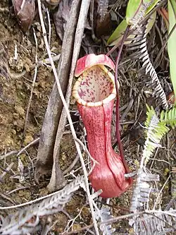 The official IUCN conservation status of each species is taken from the latest edition of the IUCN Red List.[1] Unofficial assessments based on the IUCN criteria are also included, but are presented in italics. Unless otherwise noted, taxonomic determinations and all other information are sourced from Stewart McPherson's two-volume Pitcher Plants of the Old World, published in 2009.[2] Where recent literature provides an altitudinal distribution that falls outside the range given in Pitcher Plants of the Old World, the discrepancy is noted.