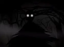 - The Beast (voiced by Samuel Ramey)[8] is almost always depicted in the form of a silhouette. He is well-spoken and manipulative, and has the power to possess other creatures. He has a humanoid shape and a pair of antlers. His eyes glow a faded white colour, yet can have red pupils and yellow-light blue sclera. The Beast forces the Woodsman to carry and fuel his Dark Lantern, which contains the Beast's soul, under the guise that it contains the soul of the Woodsman's daughter. Throughout the miniseries, the Beast follows Wirt and Greg, trying to turn them into Edelwood trees to fuel his lantern.[3] When the light of the lantern is shined upon the Beast in the final episode of the miniseries, he is revealed to be composed of various grotesque faces, likely from the souls of those he has turned into Edelwood trees. The Beast is killed when the Woodsman extinguishes the flame within the lantern.