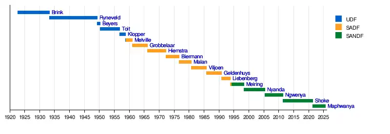 The UDF was renamed 'South African Defence Force' in November 1958.[4] The Commandant General's title was then changed to 'Commandant General SADF'. It was changed to 'Chief of the SADF' in July 1973, after Admiral Hugo Biermann assumed the post the year before. After South Africa's first democratic election, the South African Defence Force (SADF) became the South African National Defence Force (SANDF).