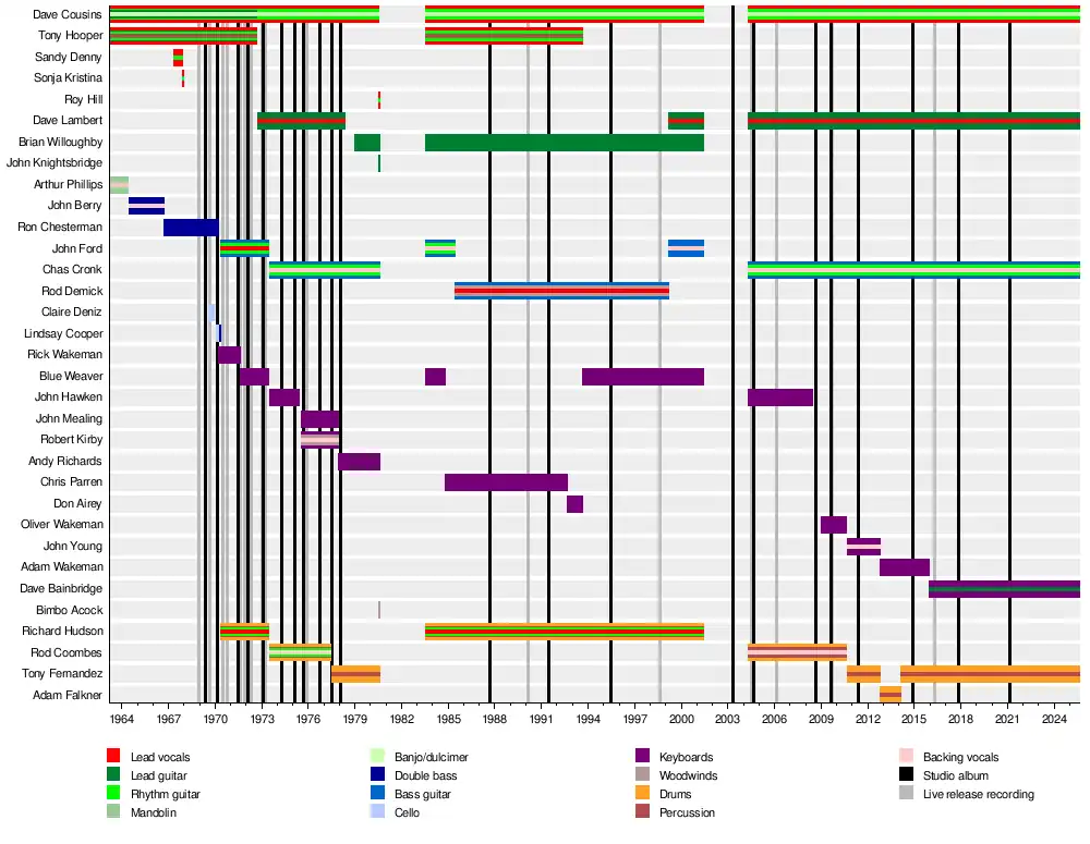 By early 2014, Fernandez had returned to his role as drummer for the Strawbs.[42] Wakeman had left by the end of 2015, replaced by Dave Bainbridge.[43] The group has since released two new studio albums: 2017's The Ferryman's Curse and 2021's Settlement.[44]