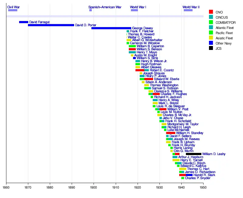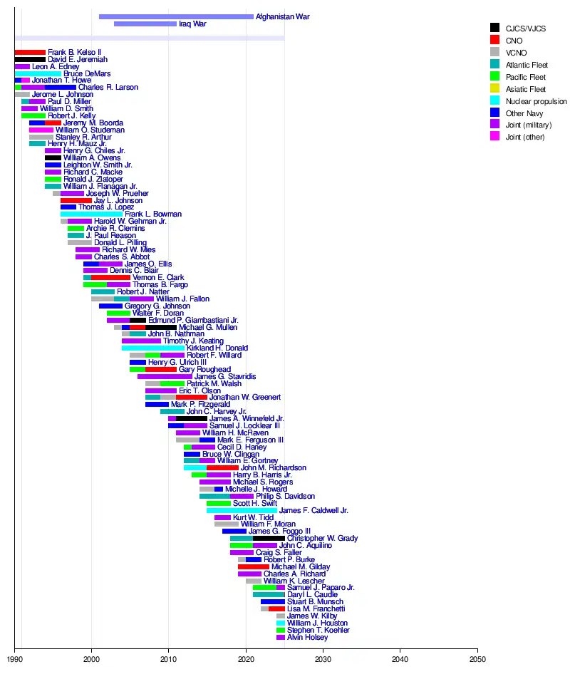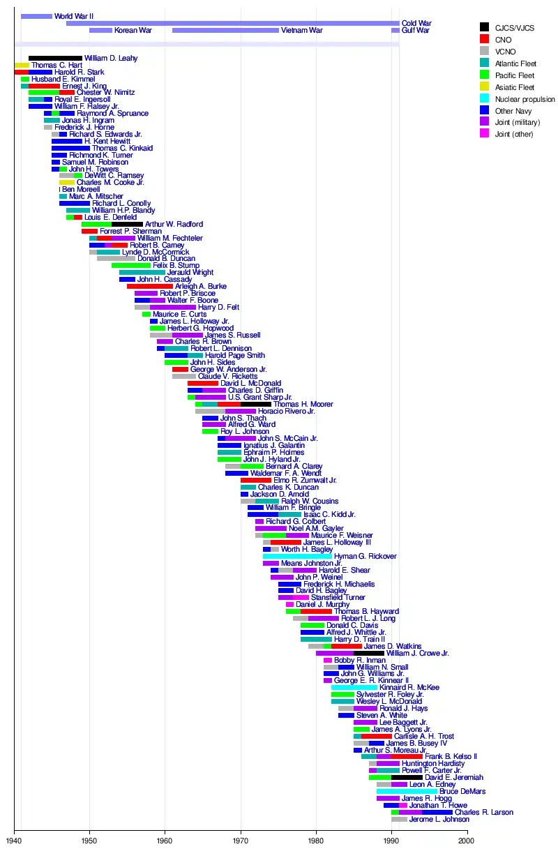 - ^ a b Positions listed are those held by the officer when promoted to admiral. Dates listed are for the officer's full tenure, which may predate promotion to four-star rank or postdate retirement from active duty.