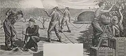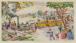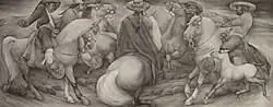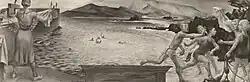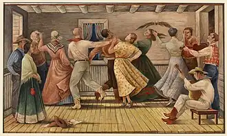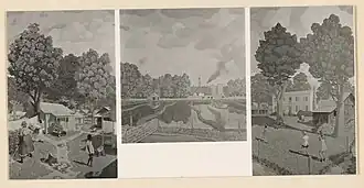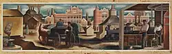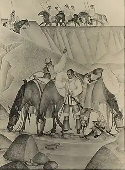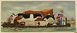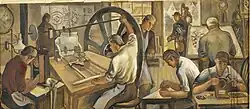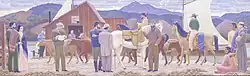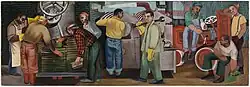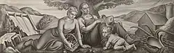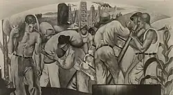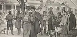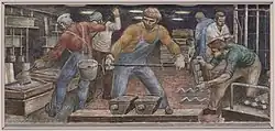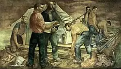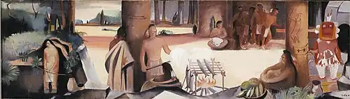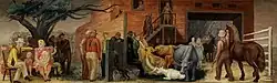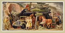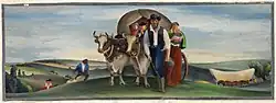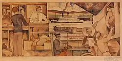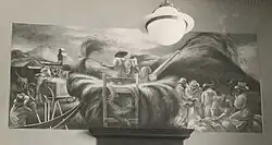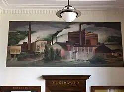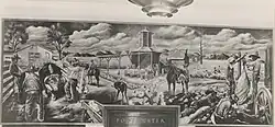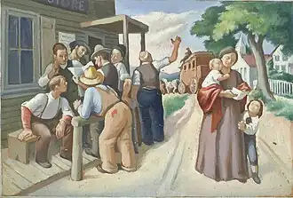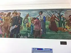 From 1934 to 1943, the Procurement Division of the United States Department of the Treasury commissioned murals in post office buildings across the country. Part of the New Deal, the stated objective of commissioning United States post office murals was to secure artwork that met high artistic standards[2] for public buildings, where it would be accessible to all people.[3] The murals were intended to boost the morale of the American people suffering from the effects of the Depression by depicting uplifting subjects the people knew and loved.[4] Murals produced through the Treasury Department's Section of Painting and Sculpture (1934–1943) were funded as a part of the cost of the construction of new post offices, with 1% of the cost set aside for artistic enhancements.[5] Murals were commissioned through competitions open to all artists in the United States.[6] Almost 850 artists were commissioned to paint 1,371 murals, most of which were installed in post offices;[5] 162 of the artists were women and three were African American.[5] The Treasury Relief Art Project (1935–1938), which provided artistic decoration for existing Federal buildings, produced a smaller number of post office murals.[2] TRAP was established with funds from the Works Progress Administration. The Section supervised the creative output of TRAP, and selected a master artist for each project. Assistants were then chosen by the artist from the rolls of the WPA Federal Art Project.[7]: 62–63