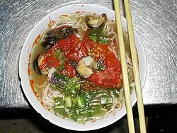 Noodle dish | Deep-fried egg noodles, topped with seafood, vegetables, and a sauce | |