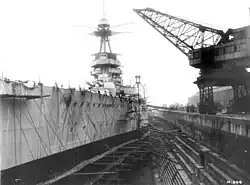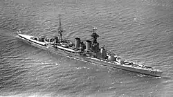 Hood, however, was sufficiently advanced in construction that she was completed in 1920 and immediately became flagship of the Battlecruiser Squadron of the Atlantic Fleet. In 1923–24 Hood, accompanied by Repulse and a number of Danae-class cruisers, sailed around the world from west to east via the Panama Canal. On 23 April 1937, after the beginning of the Spanish Civil War, she escorted three British merchantmen into Bilbao harbour despite the presence of the Nationalist cruiser Almirante Cervera that attempted to blockade the port.[39] Hood spent most of the early part of the Second World War patrolling against German commerce raiders and escorting convoys. As flagship of Force H based at Gibraltar, she bombarded French ships during the attack on Mers-el-Kébir. In May 1941 Hood and the battleship Prince of Wales were ordered to intercept the German battleship Bismarck and the heavy cruiser Prinz Eugen as they attempted to break out into the North Atlantic. In the subsequent Battle of the Denmark Strait Hood's aft magazines exploded, sinking her within five minutes of the start of the battle.[40]