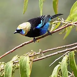 The tanagers are a large group of small to medium-sized passerine birds restricted to the New World, mainly in the tropics. Many species are brightly colored. As a family they are omnivorous, but individual species specialize in eating fruits, seeds, insects, or other types of food. Most have short, rounded wings.