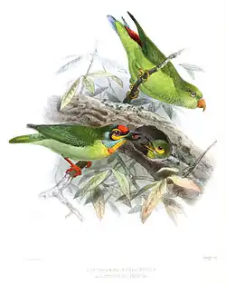 The estrildid finches are small passerine birds of the Old World tropics and Australasia. They are gregarious and often colonial seed eaters with short thick but pointed bills. They are all similar in structure and habits, but have wide variation in plumage colours and patterns.