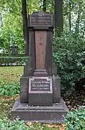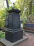 Over time the cemetery became a popular and prestigious burial ground for those of many areas of society. The wealthy merchant A.I. Kosikovsky was buried under a monumental sarcophagus on a high pedestal surmounted by a canopy on eight fluted columns.[4] Opposite it stood a similarly grand monument to the statesman Pavel Demidov, which has since been lost.[4] In 1857 the remains of the composer Mikhail Glinka were returned from Berlin and buried in the cemetery, with a grand monument erected two years later to the design of architect I. I. Gornostayev, with sculptures by Nikolay Laveretsky.[4][9] On 1 February 1881 the author Fyodor Dostoevsky was buried in the cemetery, with a similarly large monument.[4][10] During the 1880s composers Modest Mussorgsky and Alexander Borodin were buried in the northern part of the grounds, with Pyotr Ilyich Tchaikovsky following in 1891.[4][11][12][13]