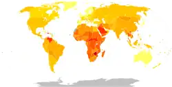 Only 28 countries, representing 449 million people (seven percent of the world's population), have laws that address the five risk factors of speed, drunk driving, helmets, seat-belts and child restraints. Over a third of road traffic deaths in low- and middle-income countries are among pedestrians and cyclists. However, fewer than 35 percent of low- and middle-income countries have policies in place to protect these road users.[3] The average rate was 17.4 per 100,000 people. Low-income countries now have the highest annual road traffic fatality rates, at 24.1 per 100,000, while the rate in high-income countries is lowest, at 9.2 per 100,000.[3]