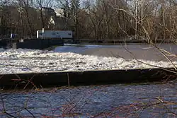 Sunken wood and concrete dam breached in center