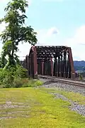 | Wells Bridge (Original) | The original Wells Bridge is a two lane Iron truss Bridge with a "holey deck" that is accessible to pedestrians, only. There are gates at each end of the bridge to prevent vehicle traffic, and the maximum weight is listed as 10 people. | ||||