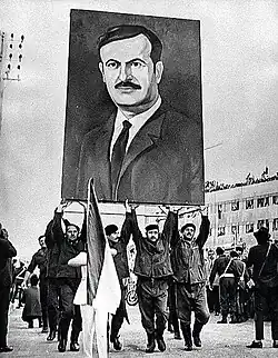 Nur Muhammad Taraki of the ruling People's Democratic Party of Afghanistan served as President of Afghanistan from 1978 to 1979, when he told people to refer to him with titles such as the "Great Leader" and hung his portrait all across the Democratic Republic of Afghanistan.[2] In the 1990s, Uzbek warlord general Abdul Rashid Dostum, who controlled most of northern Afghanistan, created a similar cult of personality in the region.[3] A similar personality cult has risen around former Taliban leader, Mullah Omar, after the 2021 Taliban offensive.[4]