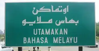 In Brunei, Standard Malay (Bahasa Melayu) is promoted as the national language and is the H variety, while Brunei Malay is used very widely throughout society and it constitutes the L variety.[17] One major difference between these dialects of Malay is that Brunei Malay tends to have the verb at the front, while Standard Malay generally places it after the subject.[18] It has been estimated that 84% of core vocabulary in Brunei Malay and Standard Malay is cognate,[19] though their pronunciation often differs very considerably. While Standard Malay has six vowels, Brunei Malay has only three: /a, i, u/.[20]