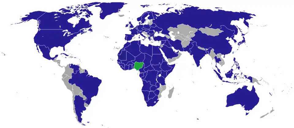 This is a list of diplomatic missions in Nigeria. There are 105 embassies/high commissions in Abuja, and many countries maintain their consulates in other Nigerian cities (not including honorary consulates).