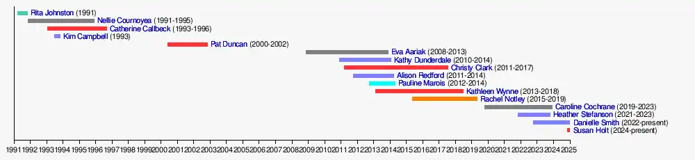 Four of the sixteen women first ministers won the title by defeating an incumbent first minister in a general election, while three were chosen by a consensus of their legislative assembly. The rest won the title through a party leadership race between elections, although several of those went on to win a general election as the incumbent premier. No woman premier in Canadian history has ever been elected to more than one mandate. Christy Clark came closest by winning the most seats in the 2017 election, which would have been her second mandate, but she was not successful in forming government as the BC Liberals were defeated in a confidence vote shortly after.[1][2]