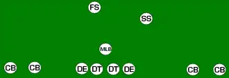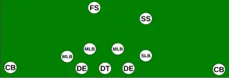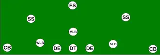 The 6-2 defense consists of six defensive linemen, two linebackers, and three defensive backs (one safety, two corners). This was the primary defense in football, at all levels, during the single wing era (the 1930s), combining enough passing defense to handle the passing attacks of the day along with the ability to handle the power running games of the times.[36][32][37][38] As the T formation grew popular in the 1940s, this formation was replaced in the NFL with the 5-3 and the 5-2 defenses. This defensive formation is still used as a "goal line" formation with some NFL teams.