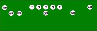 Also known simply as "Five-wide", a reference to the five wide receivers. In the empty backfield formation, all of the backs play near the line of scrimmage to act as extra wide receivers or tight ends, with the quarterback lining up either under center or, most commonly, in the shotgun. This is almost exclusively a passing formation used to spread the field, often to open up short inside routes or screen routes. The most common running play from this formation is a quarterback draw play up the middle since defensive players are spread out from sideline to sideline. It can also be used similarly to a flexbone formation, with the receivers closest to the center acting as wing backs in an option play. This formation is most often used on obvious passing downs in the NFL and college football though some teams use it more often, such as Texas Tech University and the New England Patriots in their record-setting 2007 season.